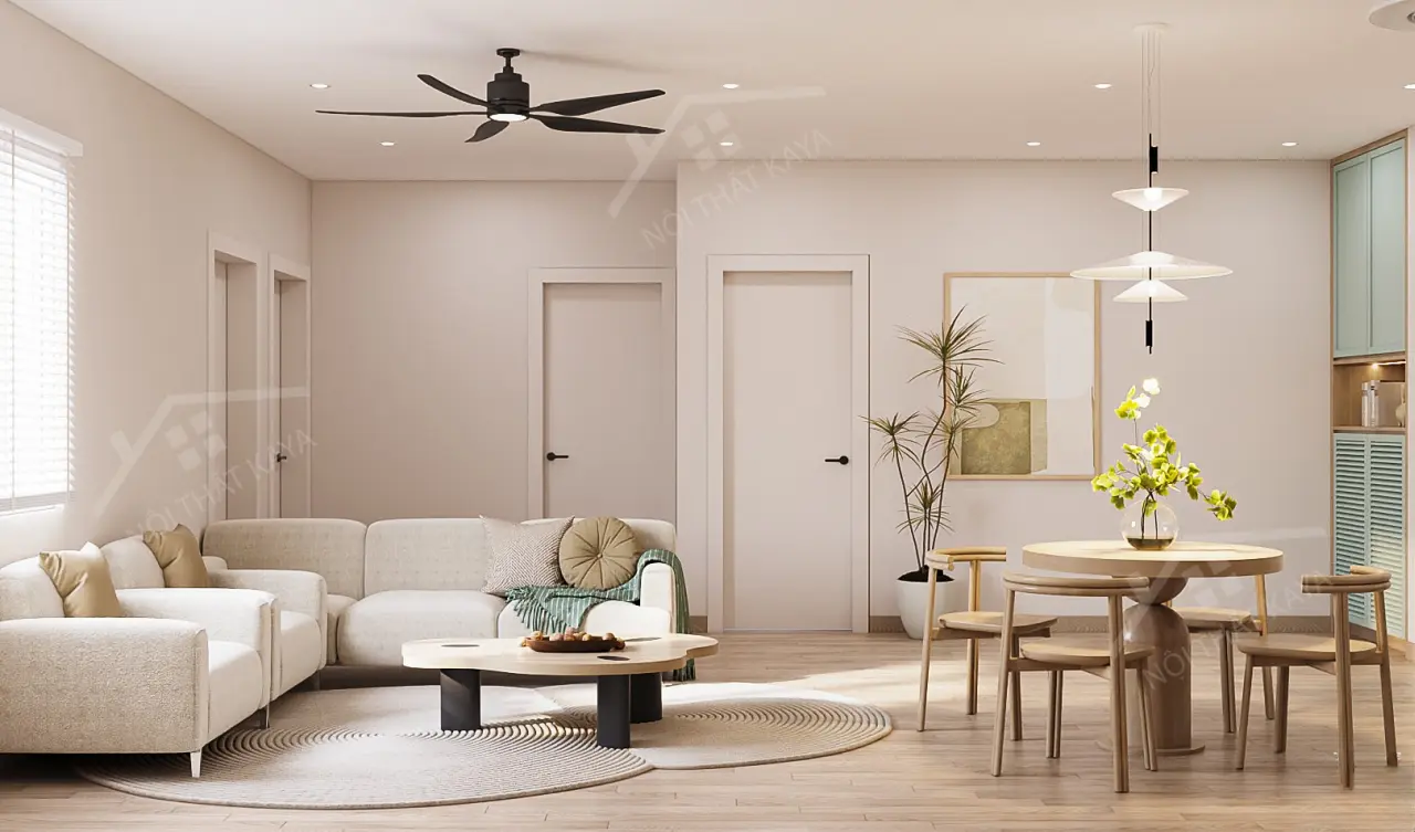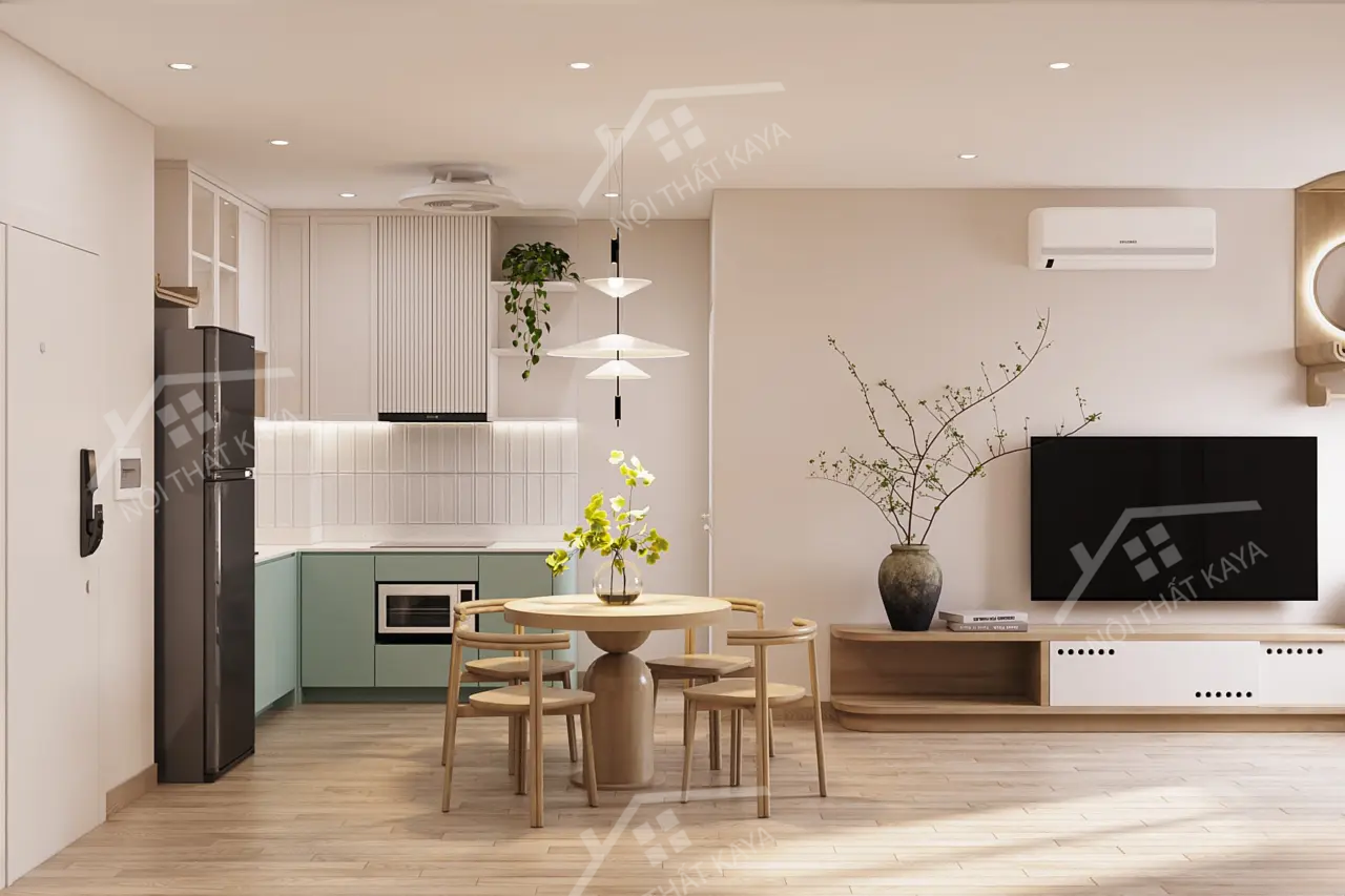 - Phòng khách được bố trí sofa nhỏ gọn, bàn trà, kệ tivi hiện đại, kết hợp khu bếp mở liền kề, tạo nên không gian sinh hoạt tiện lợi và gần gũi.