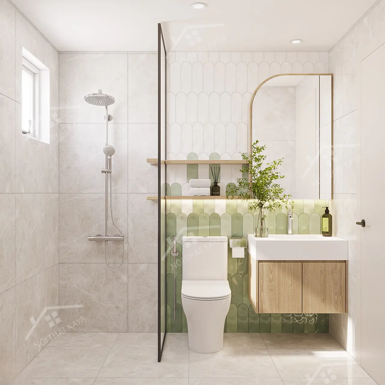 - Góc tắm đứng kính trong, lavabo gọn gàng giúp không gian luôn sạch sẽ, dễ sử dụng.