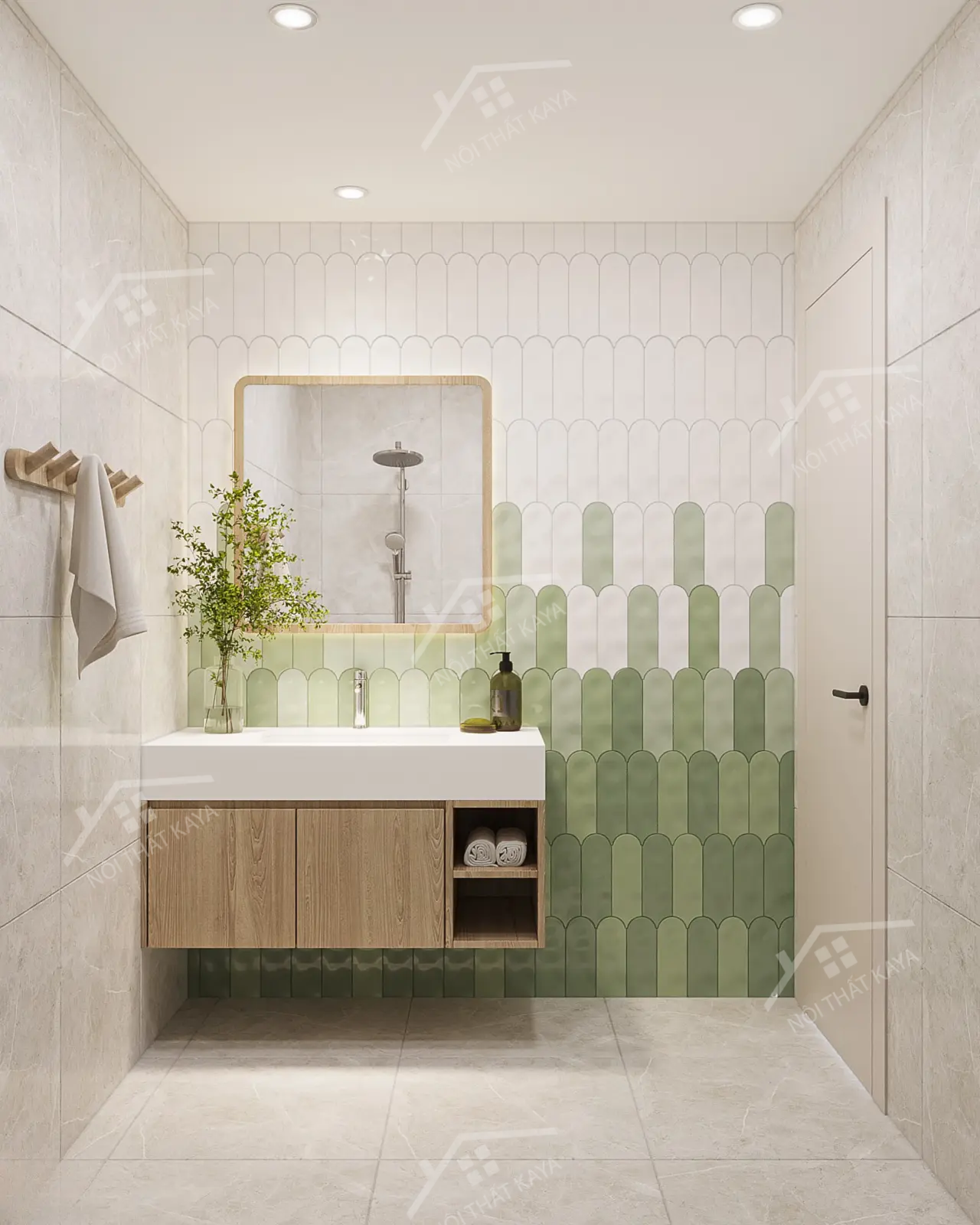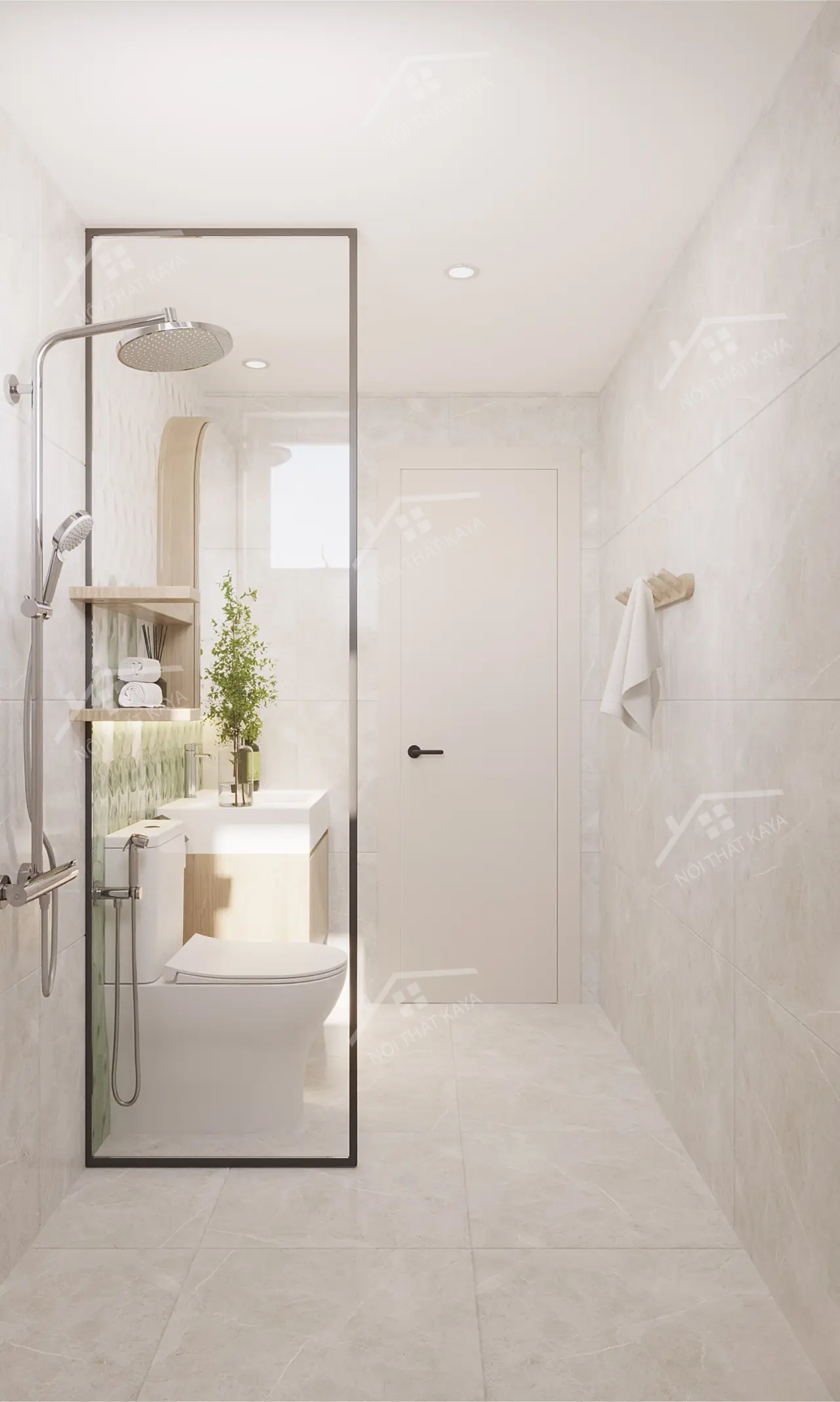 - Phòng tắm được trang bị thiết bị vệ sinh cao cấp, thiết kế tối giản với gam màu sáng.