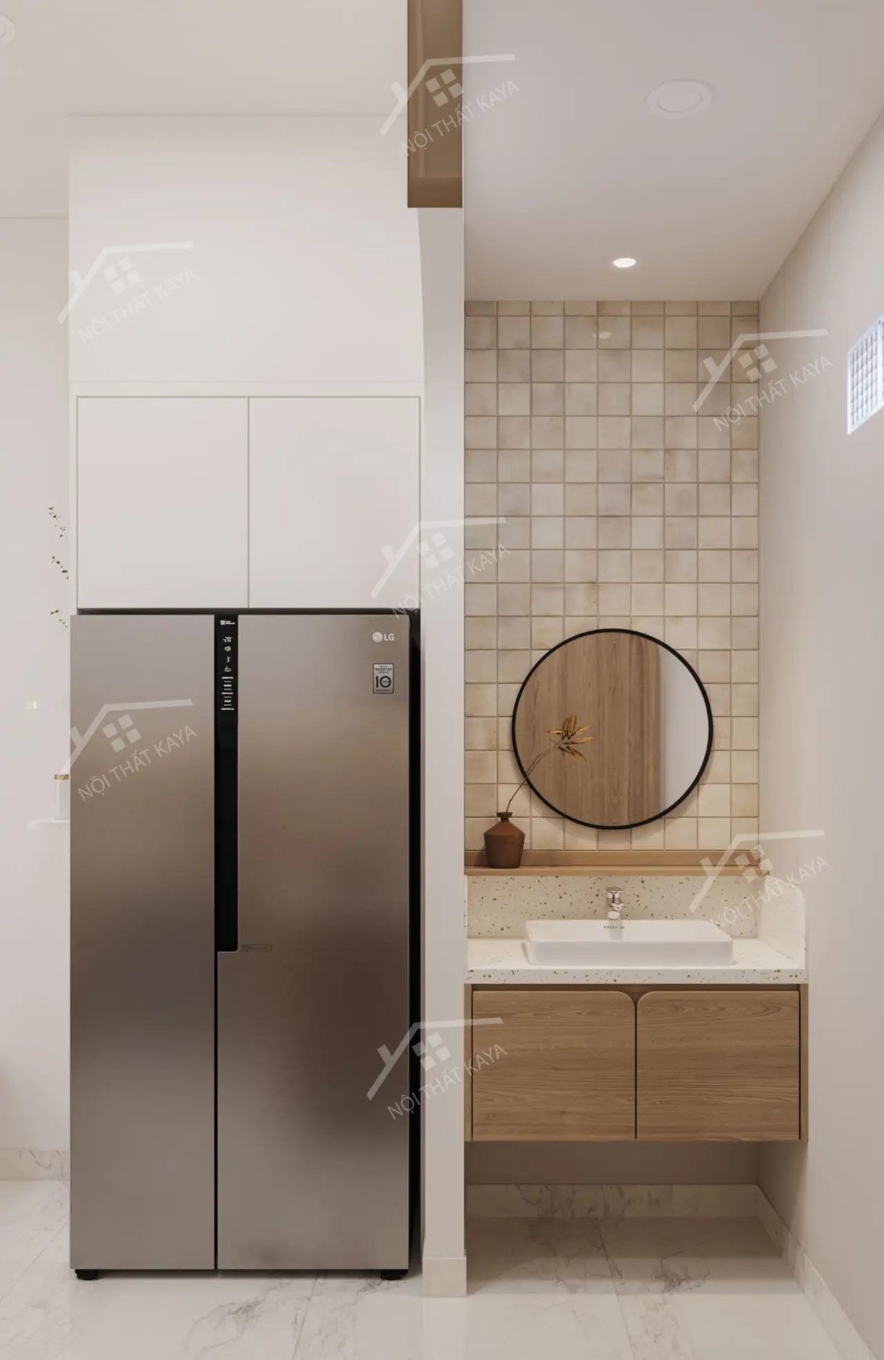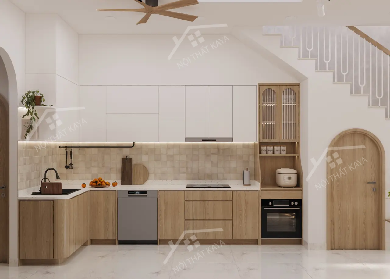 - Không gian bếp liền kề với tủ bếp chữ L, mặt bếp đá sáng màu, kết hợp gỗ xám – trắng tinh khôi, mang lại cảm giác sạch sẽ và hiện đại.