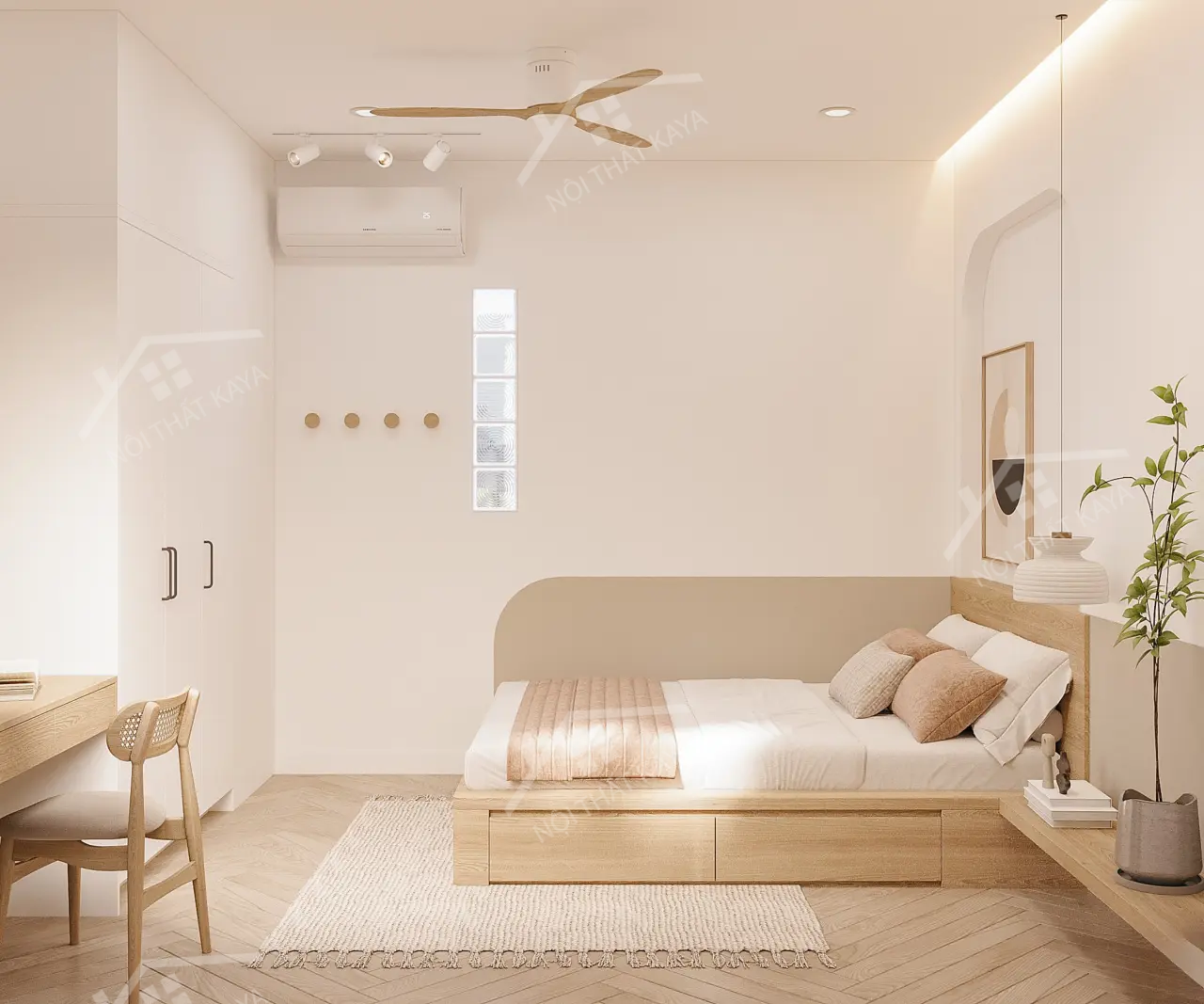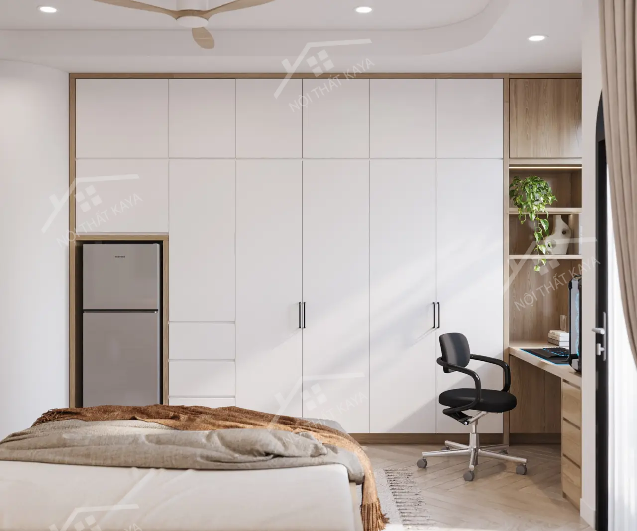 - Phòng ngủ khách được tối ưu diện tích với nội thất gỗ công nghiệp phủ trắng, mang lại cảm giác nhẹ nhàng, dễ chịu.