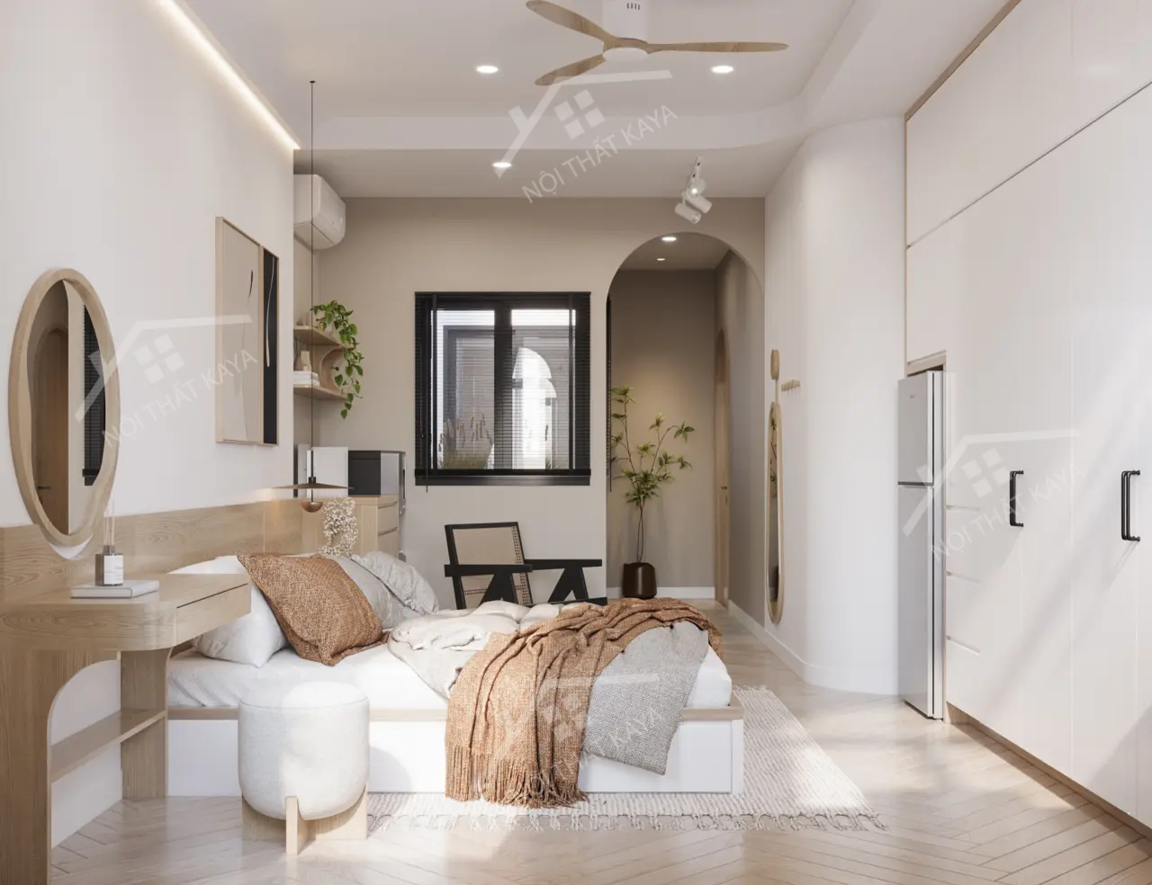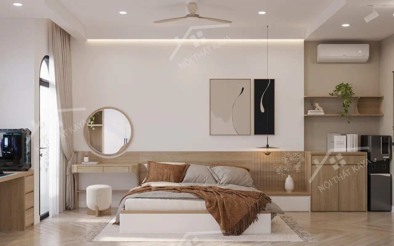 - Giường ngủ, tủ kết hợp bàn làm việc và bàn trang điểm được thiết kế đồng bộ, tạo nên không gian nghỉ ngơi thư thái và tinh tế cho gia chủ.