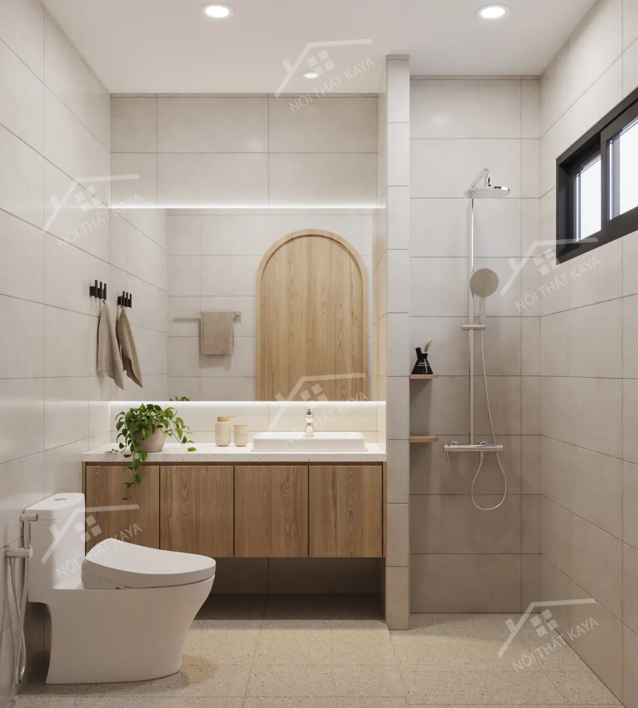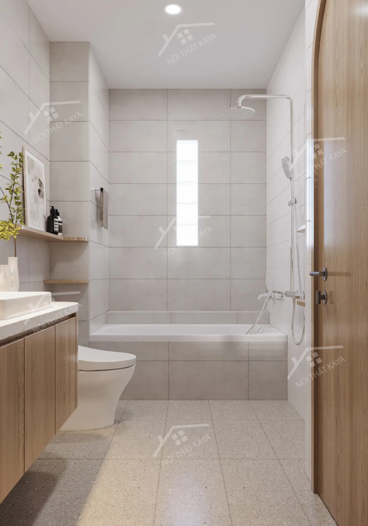 - Phòng tắm sử dụng thiết bị vệ sinh cao cấp, gạch ốp sáng màu kết hợp kính trong, tạo cảm giác rộng rãi và sạch sẽ.