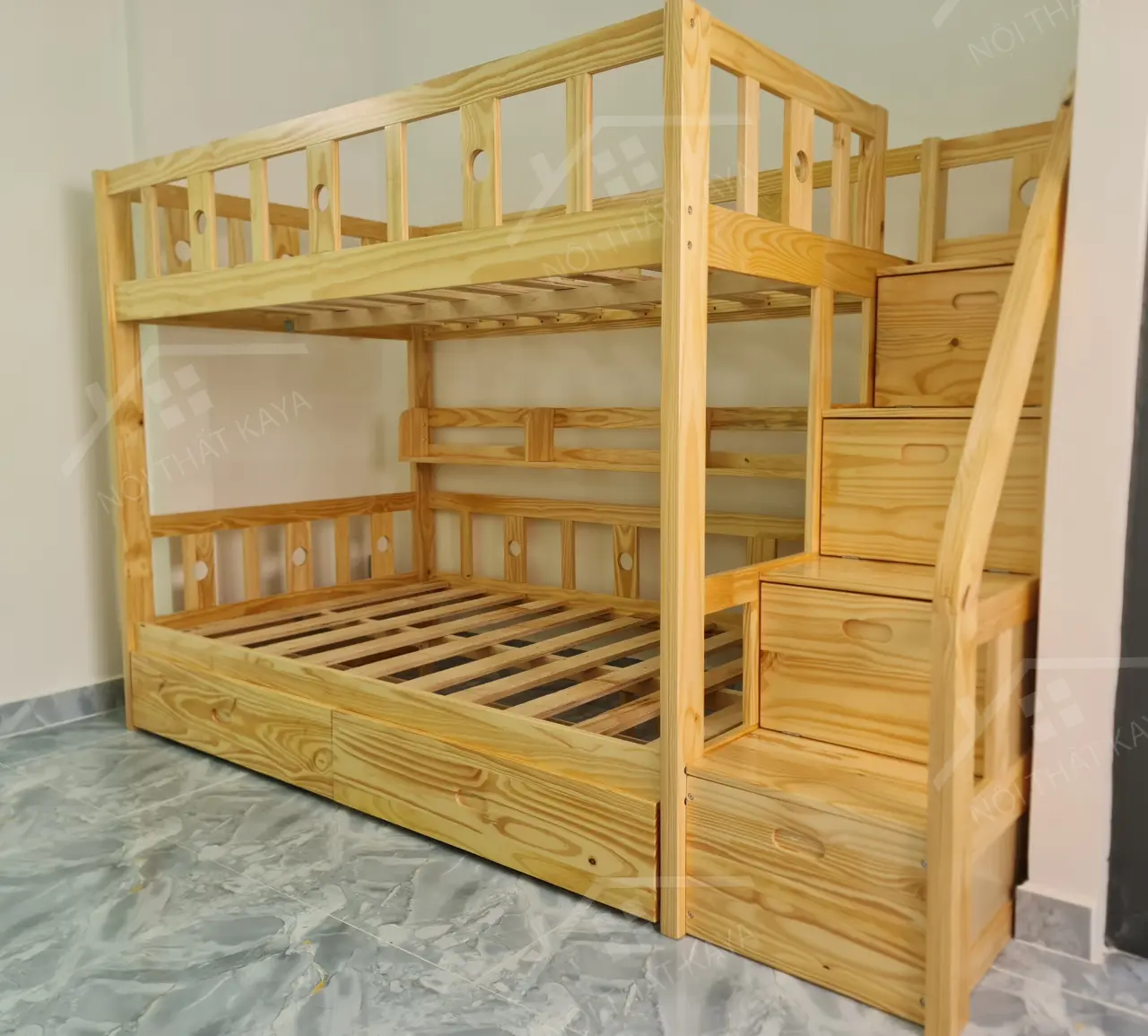 Tầng trên: lan can 4 mặt đảm bảo an toàn tuyệt đối cho người sử dụng - Tiện ích: gồm 2 tầng giường (2 hộc kéo) hoặc 3 tầng giường và 3 hộc tủ cầu thang chứa đồ tiện lợi