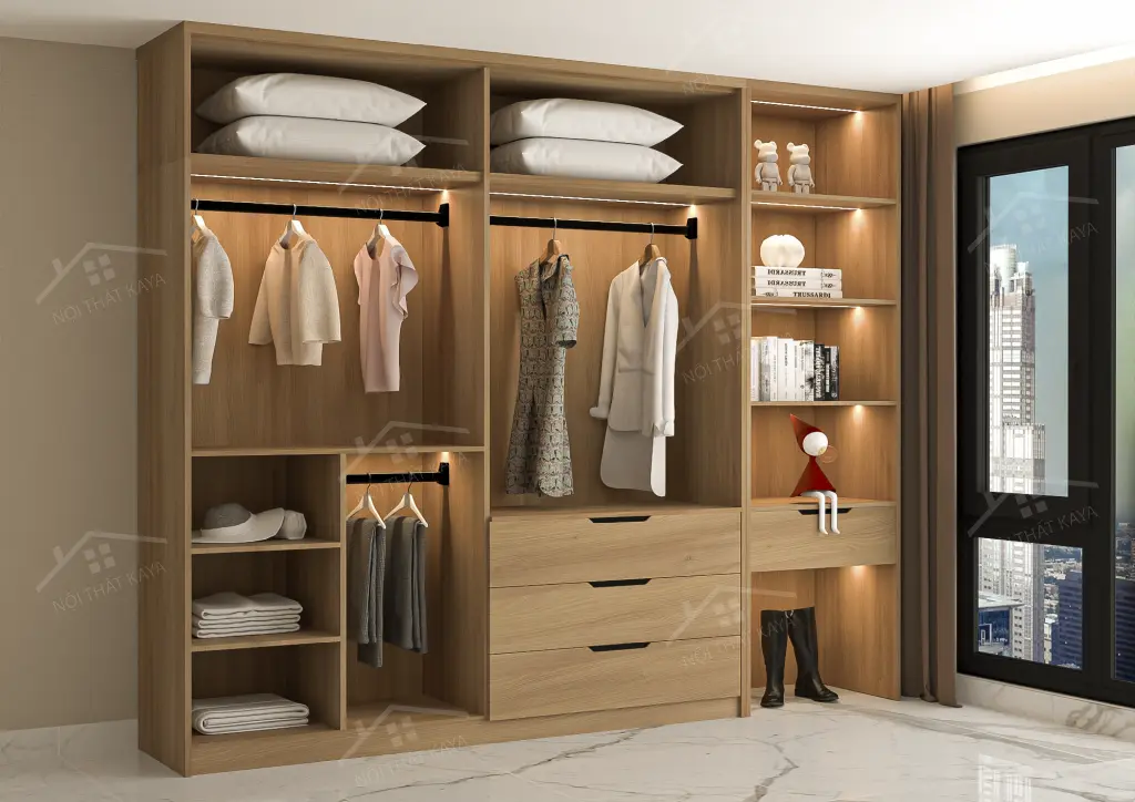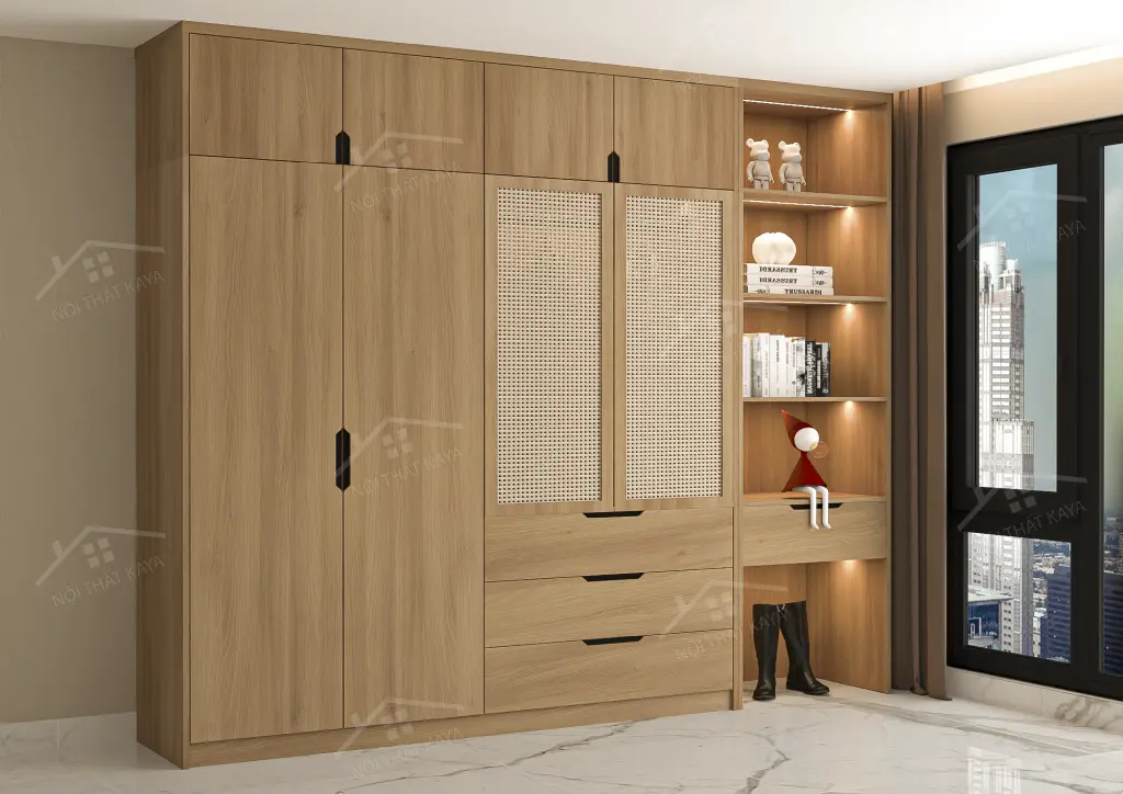 • Chất liệu: Gỗ công nghiệp Ba Thanh hoặc An Cường lõi xanh chống ẩm, bề mặt vật liệu phủ nhựa Melamine bóng láng không thấm nước, cấu trúc bền vững không ẩm mốc, chống mối mọt côn trùng.